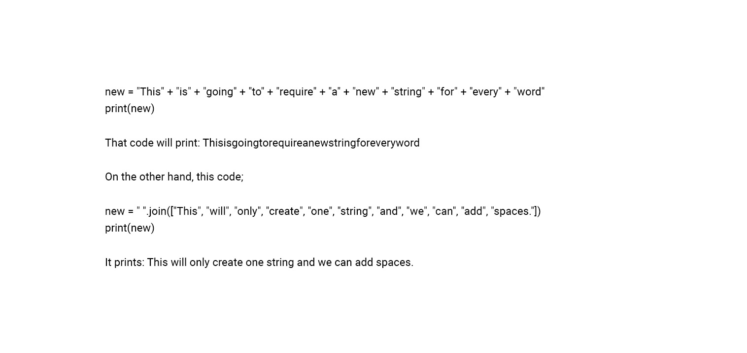 In Python, concatenating strings use “+”. However, the Python strings are immutable, and the “+” operation involves creating a new string while copying the old content at every step.