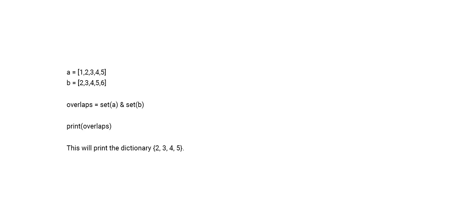 Many Python experts of a few top Python mobile app development companies in USA agree that by doing more looping, you put unnecessary strain on your server. That’s why stop doing access loops. Let’s see the example of overlapping values in two lists.